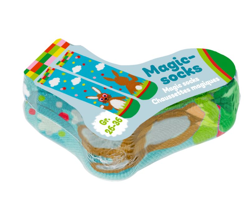 Fröhliche Ostern! Diese magischen Socken bringen Kinderaugen zum Leuchten: Einfach ins Wasser legen und beobachten, wie sich die formgepressten Socken wie von Zauberhand zur vollen Größe entfalten. Das ist Magie pur! Die Socken kommen in zwei fröhlichen D