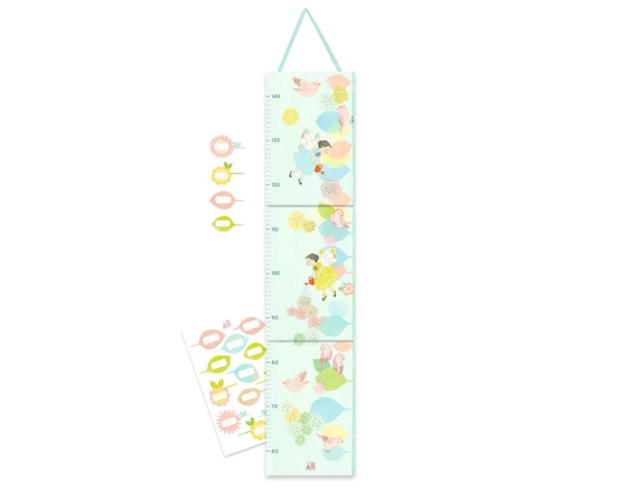 Eine große Wandmesslatte mit zahlreichen positionierbaren „Blumen-Stickern mit frühlingshaften Illustrationen. Ein tolles Dekorationsobjekt, das ideal ist, um Kinder über einen bestimmten Zeitraum hinweg zu messen (bis zu 1,40 m). Wenn das Kind älter ist,