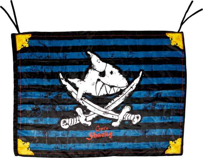 Die fällt ins Auge! Capt’n Sharky Piratenflagge mit Bändern zum Befestigen und Tunnelzug für einen Stock.