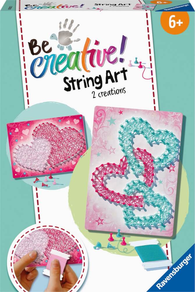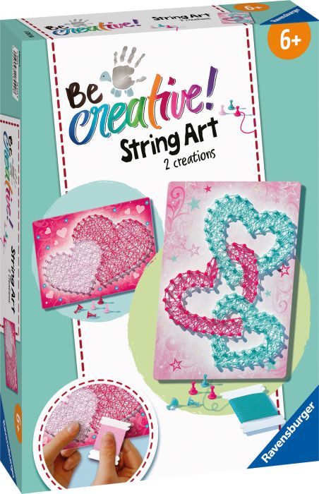 Mit dem Ravensburger StringArt-Set Hearts erlernen bereits Kinder ab 6 Jahren die beliebte Technik String Art. Hier werden keine Nägel eingeschlagen, sondern Kunststoffpins eingedrückt. Sind alle Pins gesteckt, werden auf der Vorderseite der Tafel die bunten Fäden ganz nach Belieben kreuz und quer gespannt, bis das Fadengeflecht das Motiv erscheinen lässt. Wann das Fadenbild fertig ist, entscheidet jeder selbst. String Art ist wieder voll im Trend. Mit dem Ravensburger String Art-Set erlernen bereits Grundschulkinder die beliebte Technik. Das geht ganz einfach: Die Löcher der Motivtafeln sind auf der Rückseite farbig umrandet. So ist ganz leicht zu erkennen, welcher Pin an welche Position kommen soll. Sind alle Pins gesteckt, werden auf der Vorderseite der Tafel die farblich passenden Fäden ganz nach Belieben kreuz und quer gespannt, bis das Fadengeflecht das Motiv erscheinen lässt. Wann das Bild fertig ist, entscheidet jeder selbst. Das Netz kann dabei ganz dicht sein oder auch mit vielen Zwischenräumen. Im Set enthalten sind Kunststoffpins in unterschiedlichen Farben, zwei Motivtafeln mit Vorlage sowie Garn auf Haspeln in verschiedenen Farben.