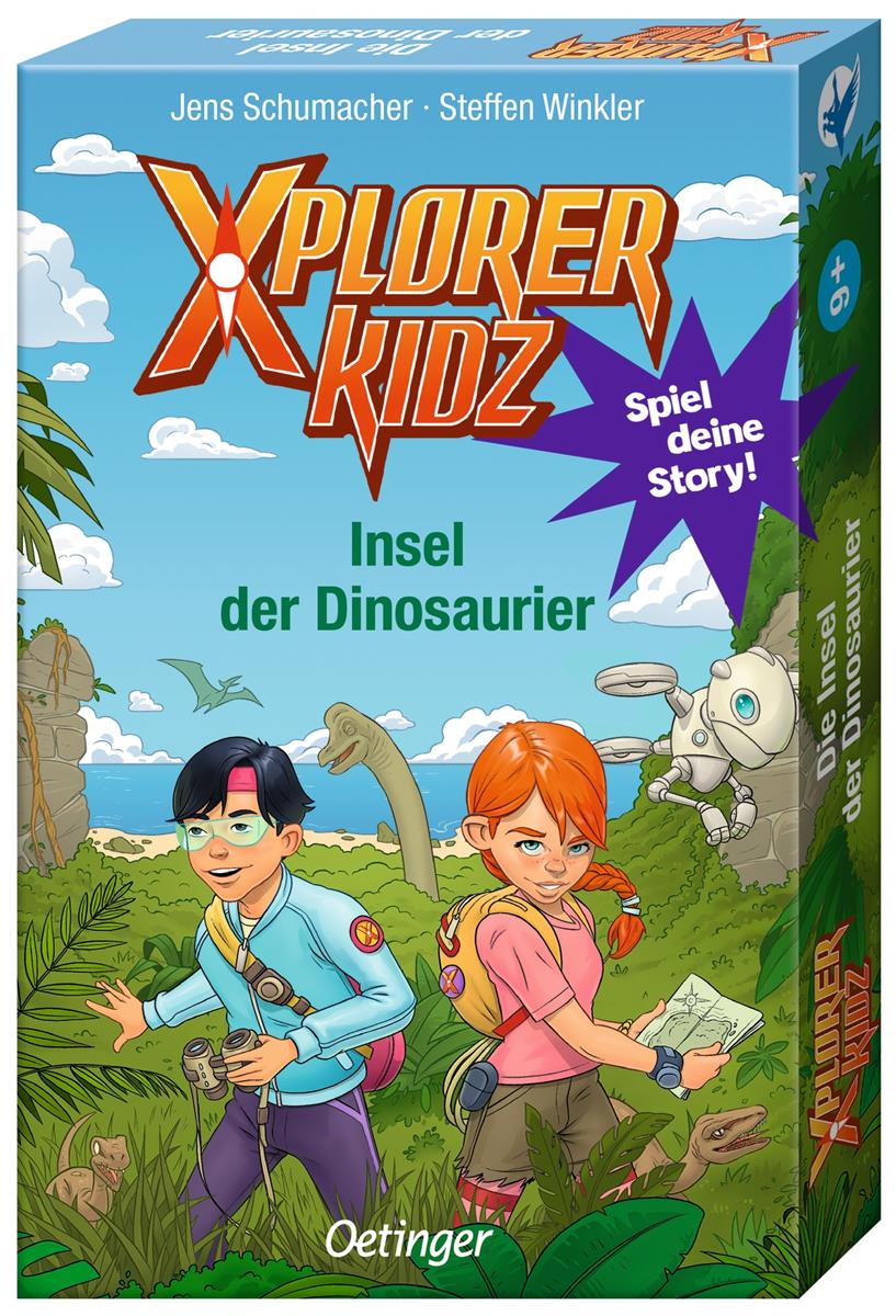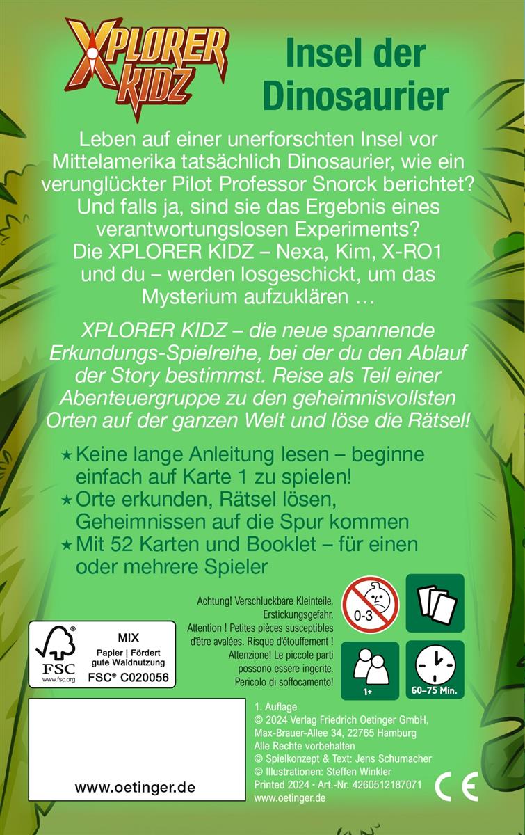 Spiel deine Story: Das interaktive Dinosaurier-Abenteuer Die Xplorer Kidz Nexa, Kim und ihr Roboter werden auf eine abgelegene Insel geschickt. Dort soll es lebende Dinosaurier geben! Können die Xplorer Kidz sie finden? Das interaktive Kartenspiel Xplorer Kidz entführt Kinder ab 9 Jahren auf eine einsame Insel. 52 Karten lassen die Spielenden in eine spannende Dinosaurier-Geschichte eintauchen: Sie reisen an geheimnisvolle Orte, erkunden abenteuerliche Schauplätze und entscheiden dabei selbst, welchen Weg sie gehen oder welche Tür sie öffnen wollen. Ein einzigartiger Spielspaß, der kleine und große Fans von Exit Games, Escape Rooms und Quest-Büchern begeistern wird. Ein spielerischer Einstieg in die Welt des Lesens für Kinder ab 9 Jahren, die Abenteuer und Rätsel lieben! Xplorer Kidz. Insel der Dinosaurier: Ein spannendes Kartenspiel für Kinder ab 9 Jahren Geschichten erleben neu gedacht: interaktives Kartenspiel und Abenteuergeschichte in einem für Kinder ab 9 Jahren. Innovativ: Das Kartenspiel führt mit 52 Karten auf eine spannende Dinosaurierjagd und bietet großen Rätsel- und Entdeckerspaß für Fans von Escape-Room-Spielen und Abenteuergeschichten. Interaktiv: Die Spielenden bestimmen den Spielverlauf selbst und machen jede Partie zu einem einzigartigen Abenteuer. Lesen und Spielen in einem: Das Konzept des „gamifizierten Lesens regt auch Wenigleser*innen zum Mitmachen an. Das interaktive Dinosaurier-Spiel ist eine geniale Mischung aus Quest-Büchern und Escape-Room-Spielen. Hier geht es nicht darum, aus einem Raum zu entkommen, sondern eine spannende Welt zu erkunden und Rätsel zu lösen, die eng mit der Geschichte verknüpft sind. Die innovative Kombination aus Lesen und Spielen ist ein großer Spaß für leseungeübte und lesefaule Kinder ab 9 Jahren.